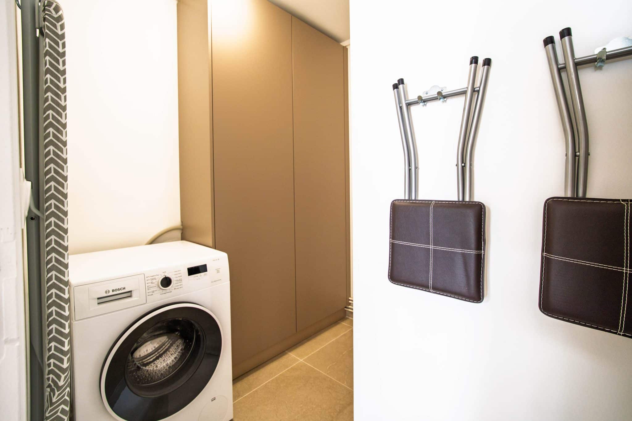 – Espace buanderie avec nombreux rangements et machine à laver.