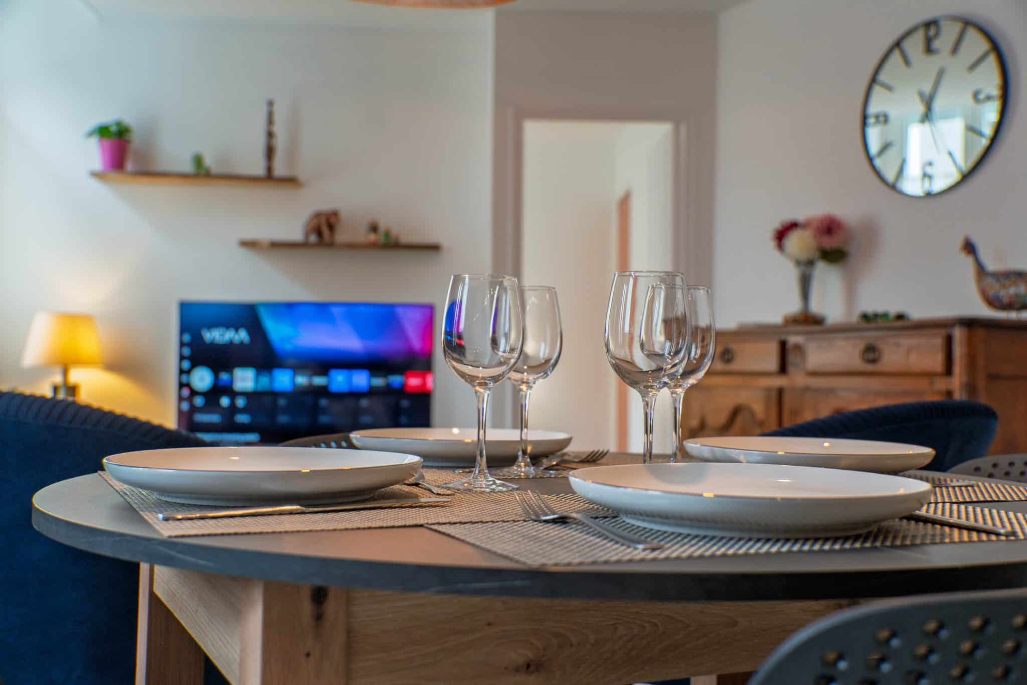 – Vous arrivez dans une grande pièce à vivre avec sa grande cuisine ouverte aménagée sur-mesure (four, micro-ondes, frigo, bouilloire, grille-pain, cafetière, lave vaisselle) et son espace pour manger confortablement à 4 personnes. Un espace salon avec canapé-lit (couchage 2 personnes 140) et 2 fauteuils pour vous relaxer et profiter de sa TV.